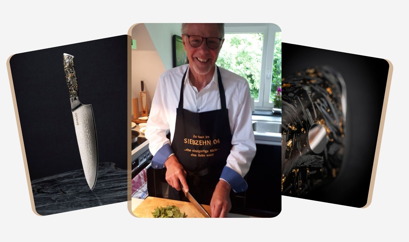 Gefertigt aus Kohlefaser, Goldfolie und Harz, liegen sie warm, rutschfest und sicher – gemacht für volle Kontrolle beim Schneiden, selbst bei langen Kochsessions.
