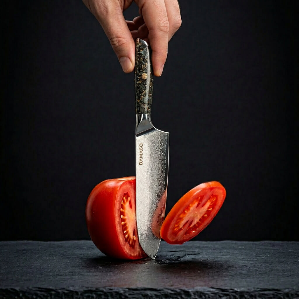 Der 12-Grad-Schleifwinkel sorgt dafür, dass die Klinge durch Tomaten, Zwiebeln und rohes Fleisch gleitet ohne zu drücken. Ein Kunde schreibt: „Scharf seit Jahren — ohne einmal nachzuschärfen."