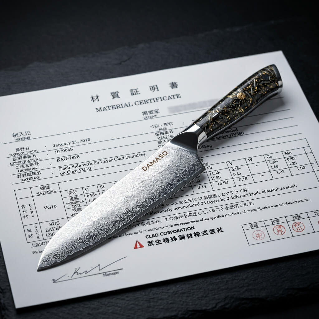DAMASO bezieht den Stahl für sein japanisches Messer von Takefu Special Steel, Japan — Charge 88633, Kobalt 1,37 %, Kohlenstoff 0,99 %. Diese Zahlen stehen in einem Materialzertifikat. Nicht in einer Marketingbroschüre. Für Hobbyköche die wissen wollen was wirklich in ihrem japanischen Küchenmesser steckt.