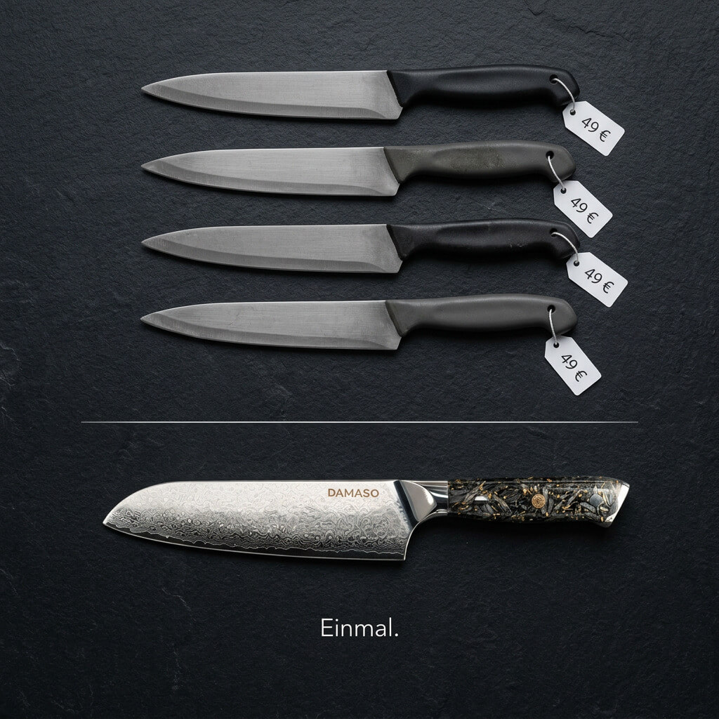 Ein normales Küchenmesser wird nach wenigen Wochen stumpf und ersetzt. DAMASO nicht. Über Jahre gerechnet ist es die günstigere Entscheidung.